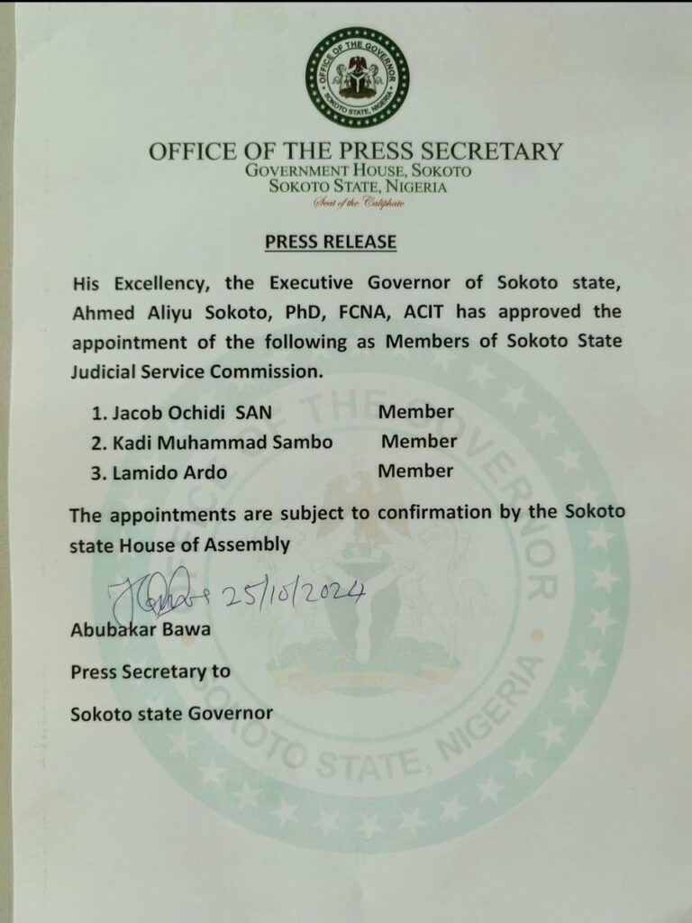 The Sokoto State Governor, Dr. Ahmed Aliyu Sokoto, PhD, FCNA, has approved the appointment of members to the Judicial Service Commission. The appointees are as follows: